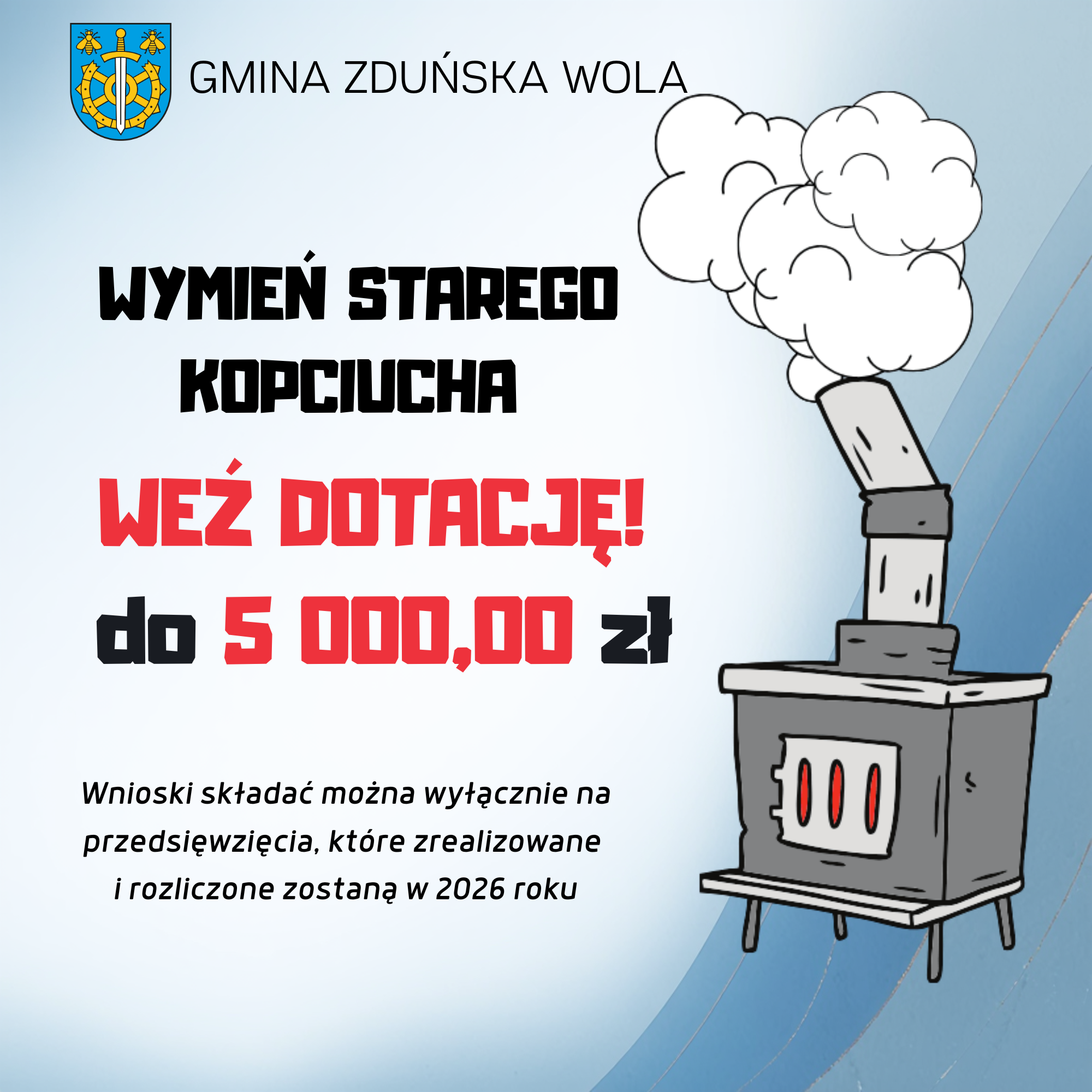 - Uchwała Rady Gminy Zduńska Wola Nr XXIV/176/2026 z dnia 29 stycznia 2026 r. w sprawie określenia zasad udzielania dotacji celowych na dofinansowanie wymiany pieców węglowych na ekologiczne źródła ogrzewania, tryb postępowania w sprawie ich udzielania i sposób ich rozliczania.