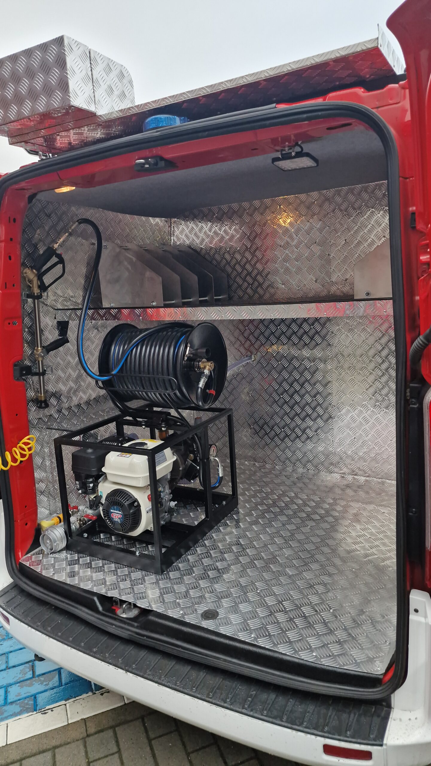 W tylnej części nadwozia pożarniczego znajduje się przedział pompowo-sprzętowy. Zamontowano w nim agregat wysokociśnieniowy ze zbiornikiem wody,