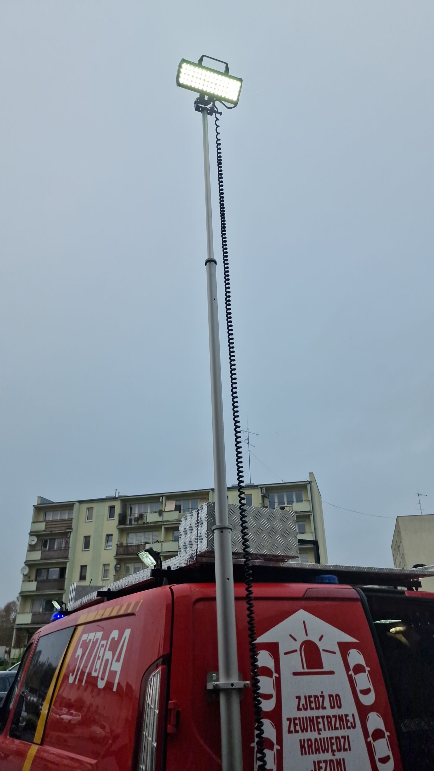 Oświetlenie miejsca działań w porze nocnej umożliwia pneumatyczny maszt oświetleniowy z reflektorami LED.