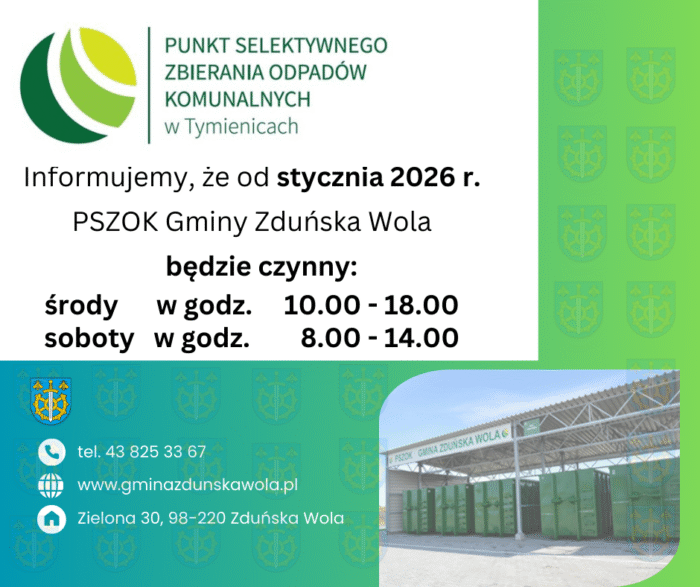 Uprzejmie informujemy, że od 1 stycznia 2026 r. zmieniają się godziny pracy Punktu Selektywnej Zbiórki Odpadów Komunalnych Tymienice ul. Orlikowa 6 (PSZOK).